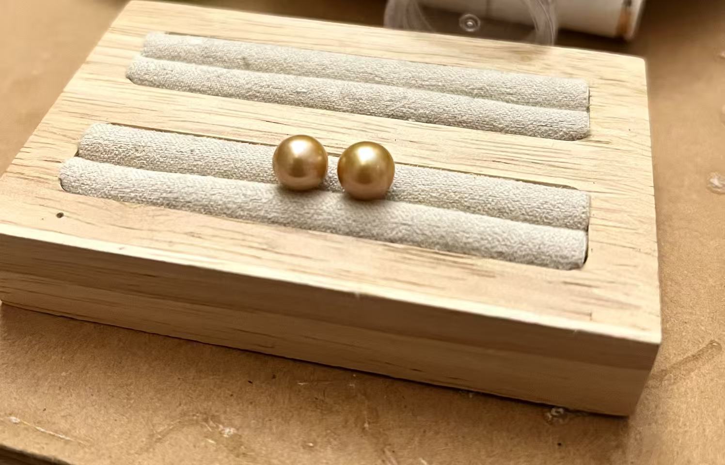 • 頂級材質 – 真正 7.4 mm 南洋珍珠,呈現極罕見的「柚木金」色澤,色調均勻且天然無染。搭配低敏 S925 純銀耳針,可選加 HKD280 升級18K金耳針。