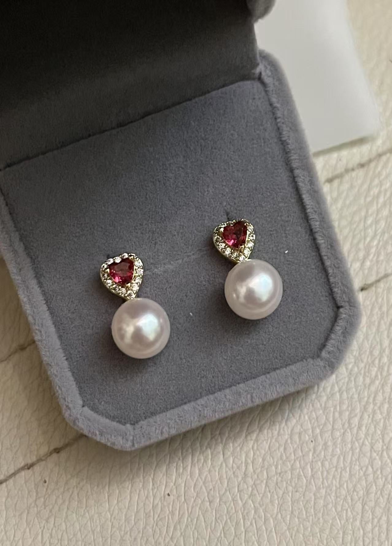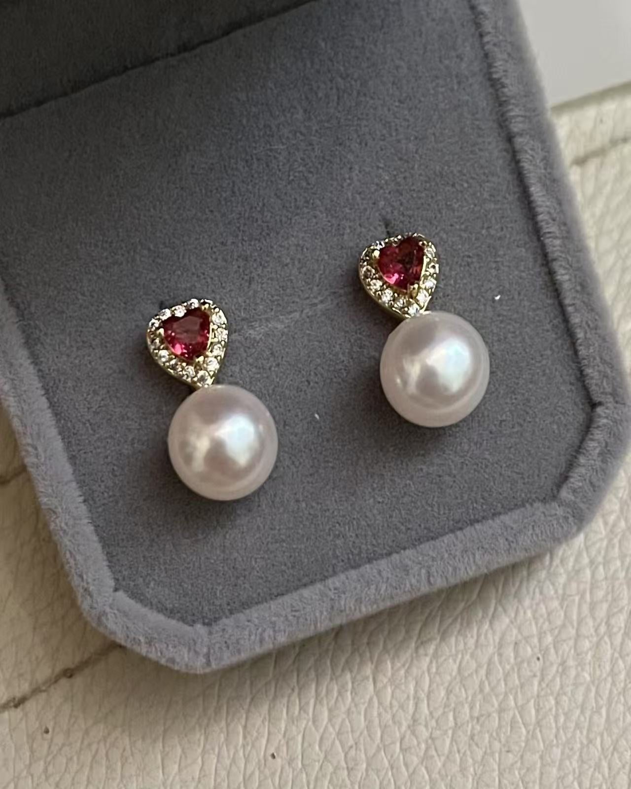 法式紅鋯石珍珠愛心耳環