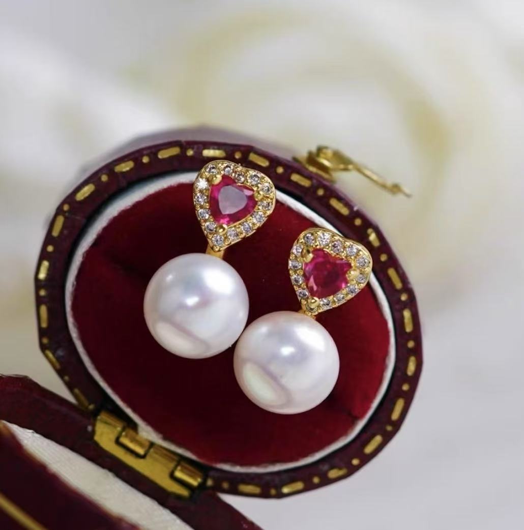 • 優質材質:9mm 5A 高光澤淡水扁圓珍珠,搭配 S925 純銀耳針,鑲嵌紅鋯石與閃亮鋯石。