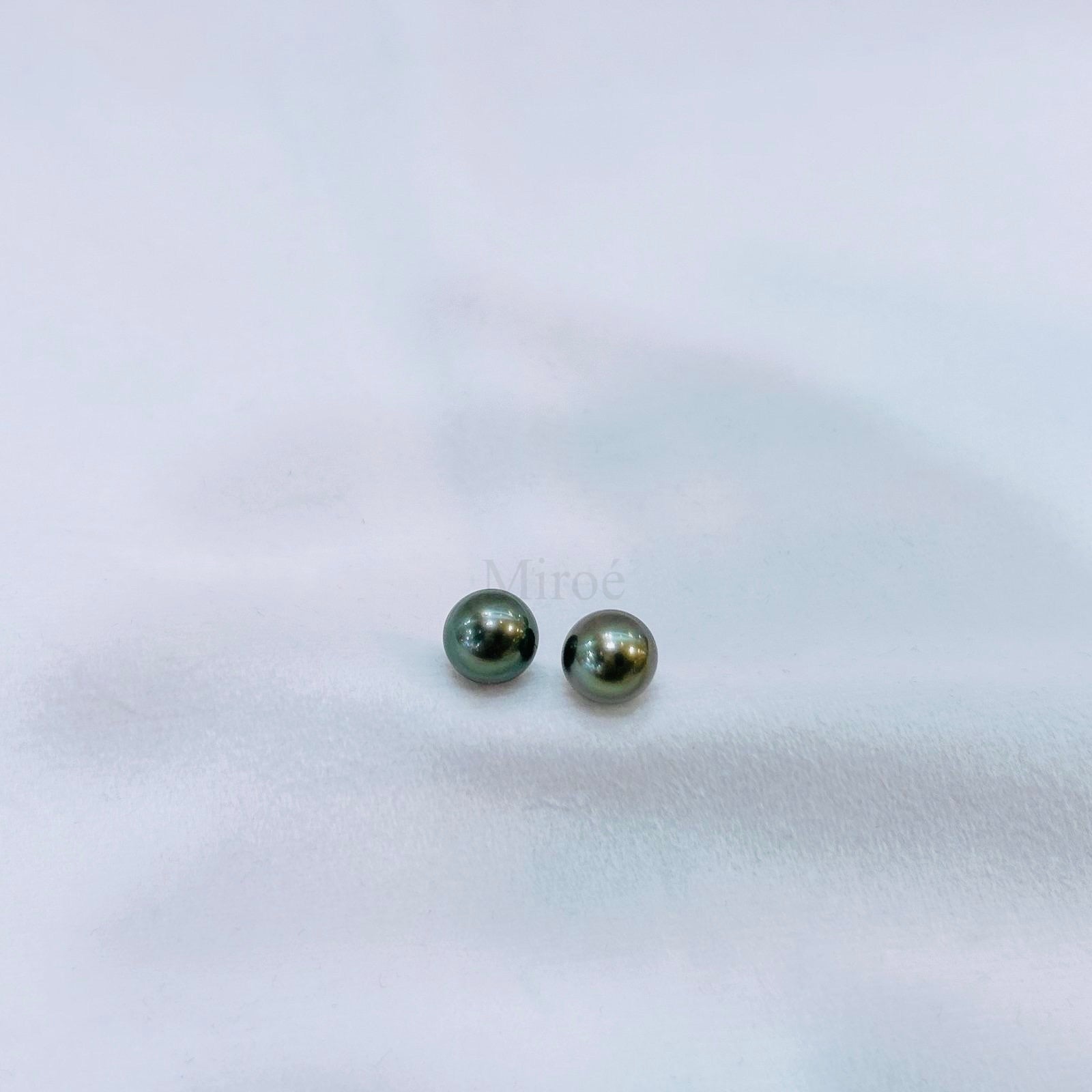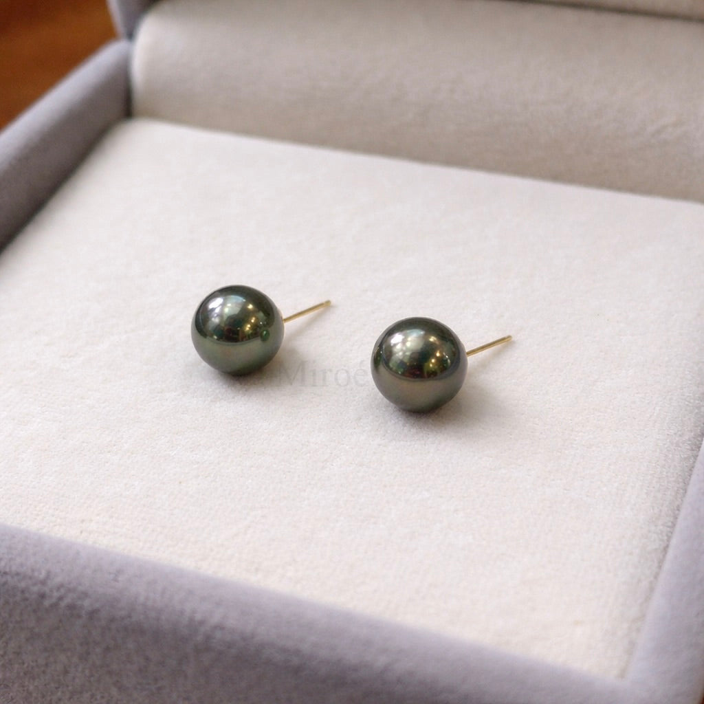 Featuring premium Tahitian seawater pearls in a rich peacock green tone, these earrings reveal subtle layers of green and metallic luster under different lighting.